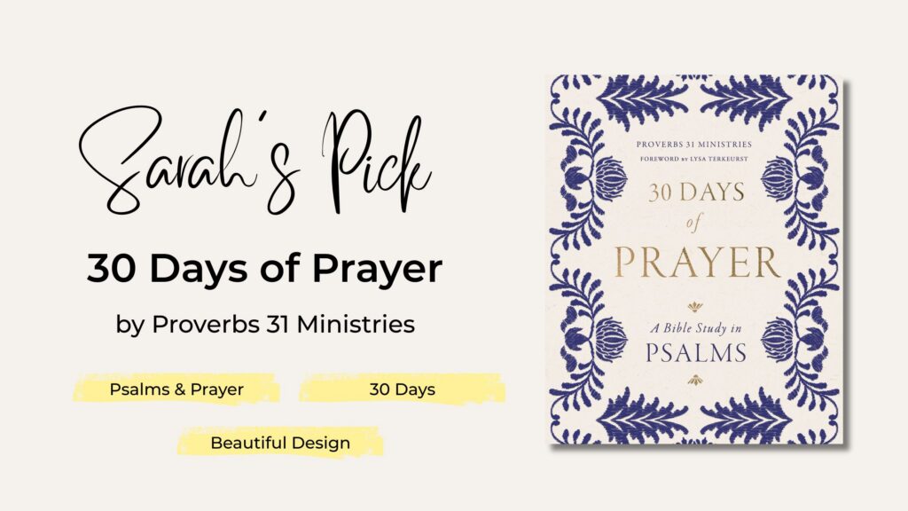 I love focusing on one topic for a month and this study combines two of my favorite things: prayer and the Psalms. 30 Days of Prayer breaks down a psalm every day and guides you through how to pray it. Each week has a theme, but every day is structured differently which kept me looking forward to what I would learn. Perfect for solo study, with a friend, or with your small group.